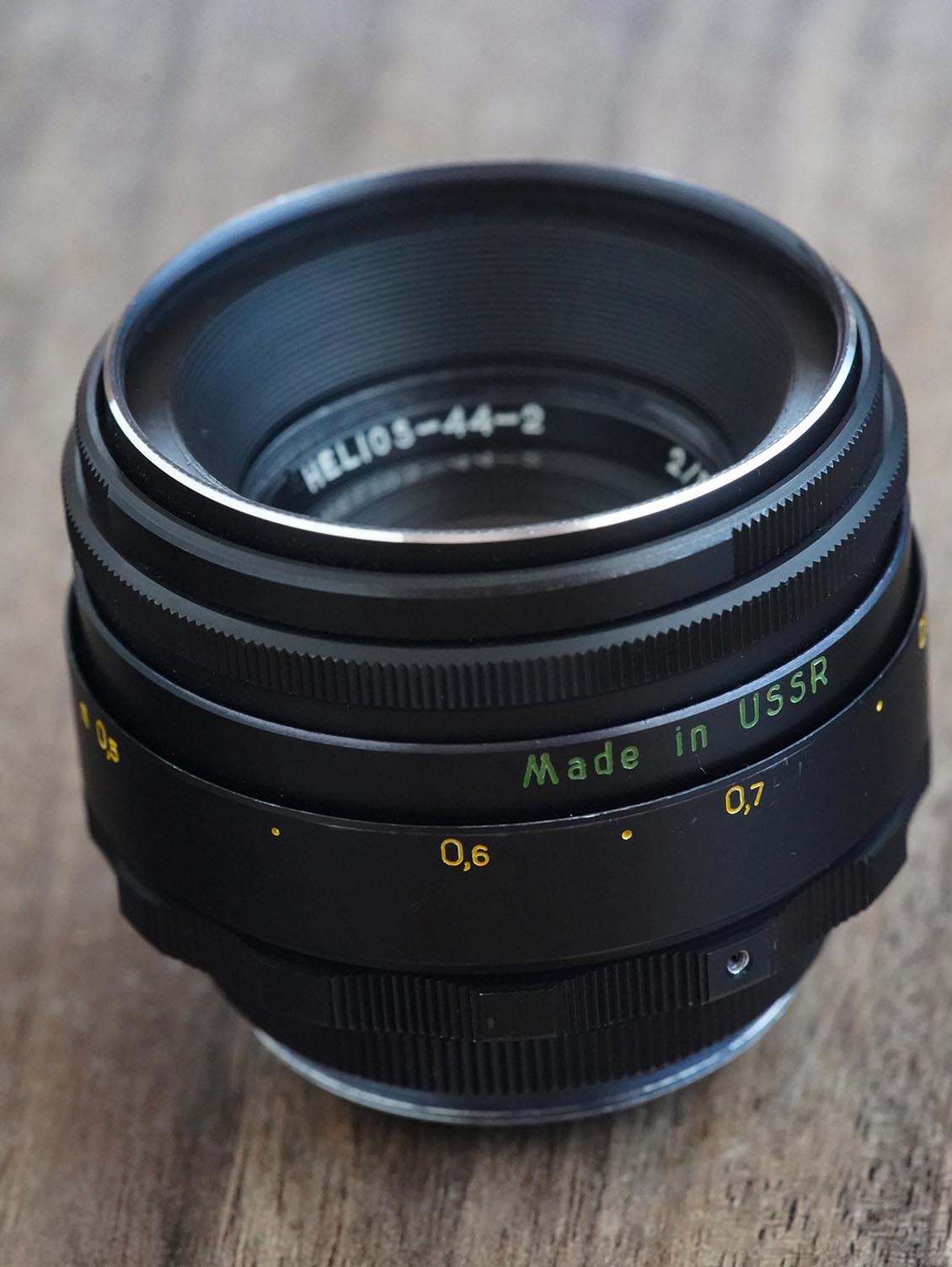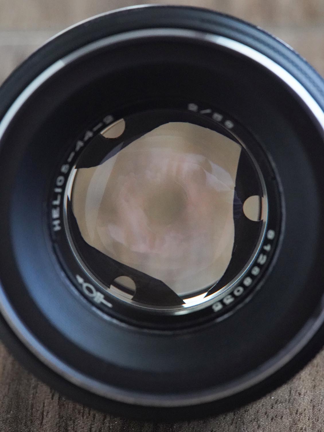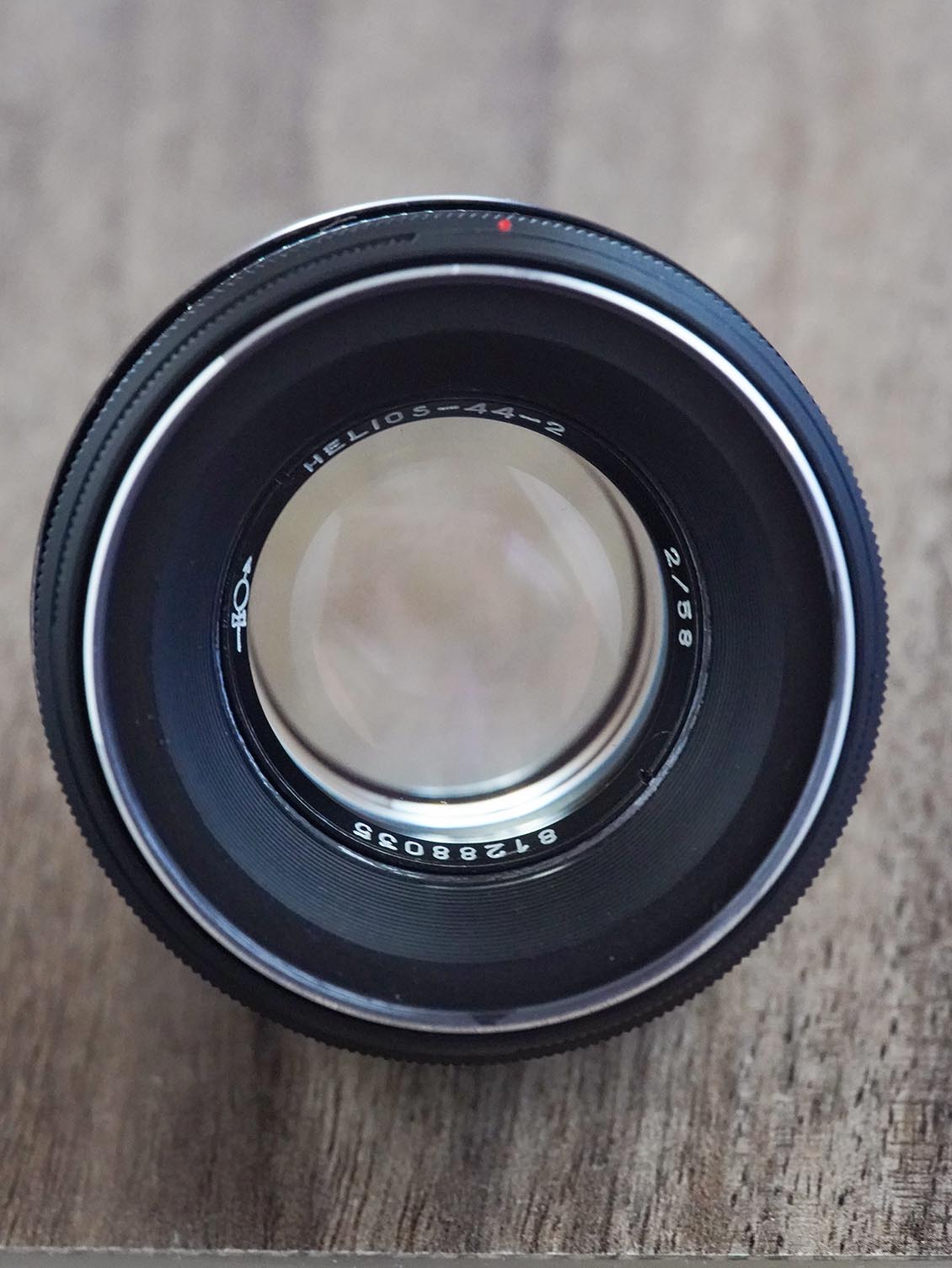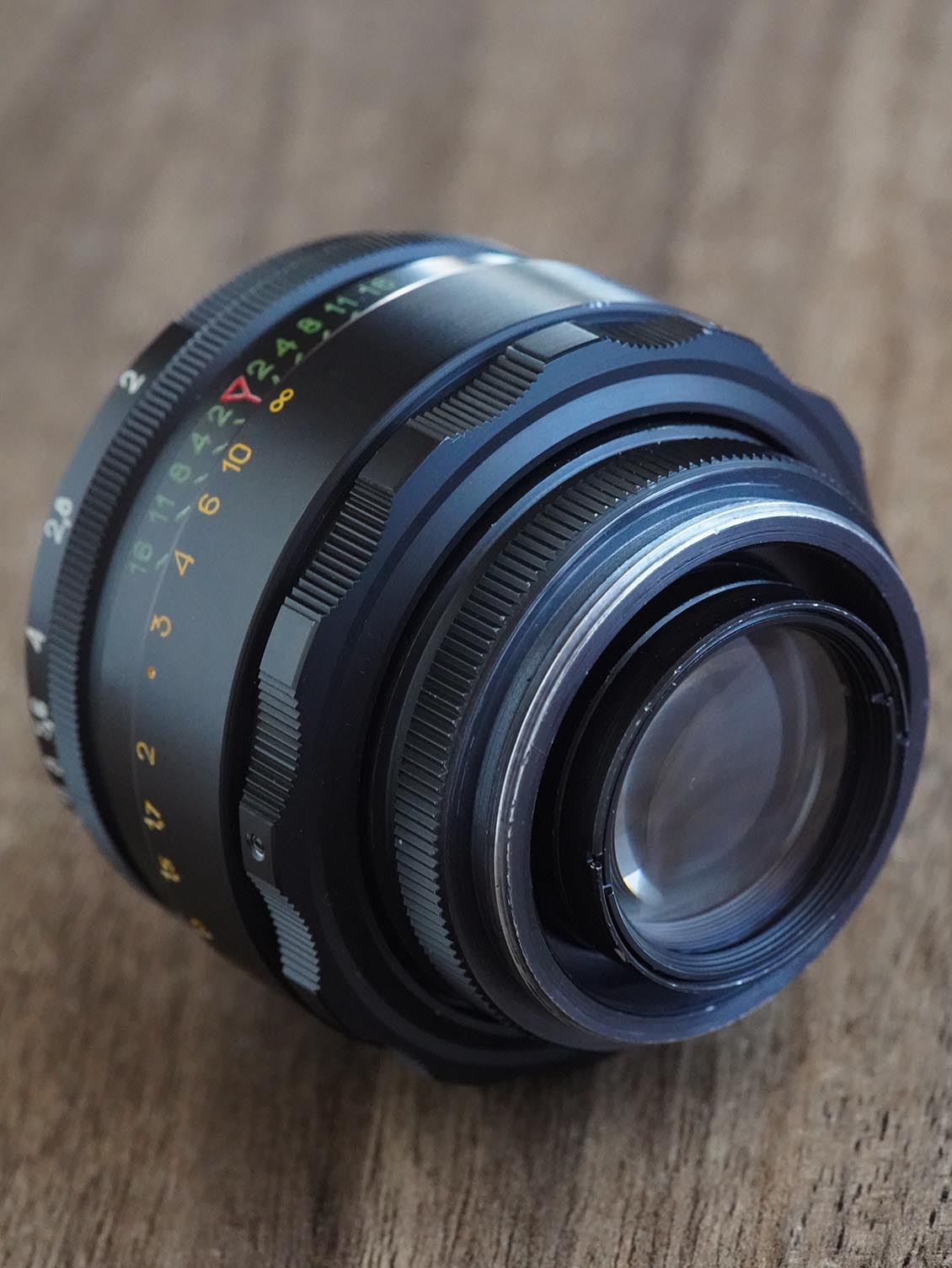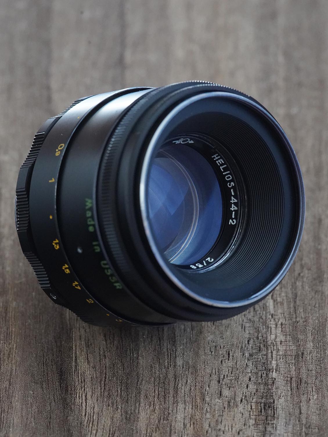 Restored using modern lubricants. The glass is washed with Zeiss products inside and out. The aperture control ring has been redesigned and now shows the correct aperture value, and not the other way around, as on all standard Helios 44-2. The ends of the glass were blackened to enhance the contrast of the lens.